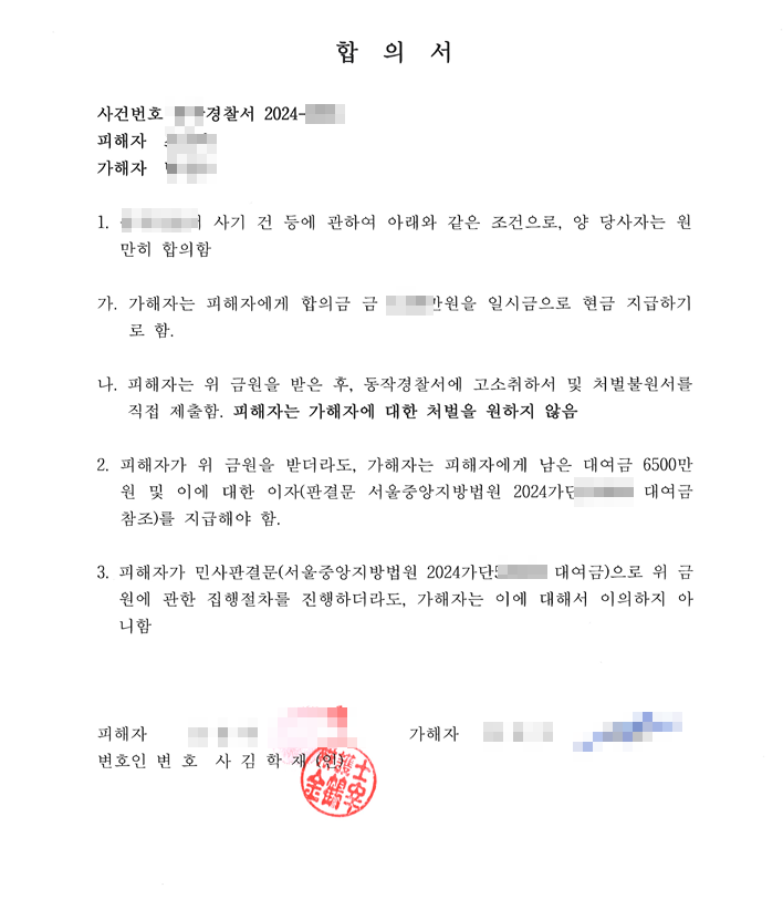 [승소] 사기죄 고소 건 피해금액 배상받고 합의완료